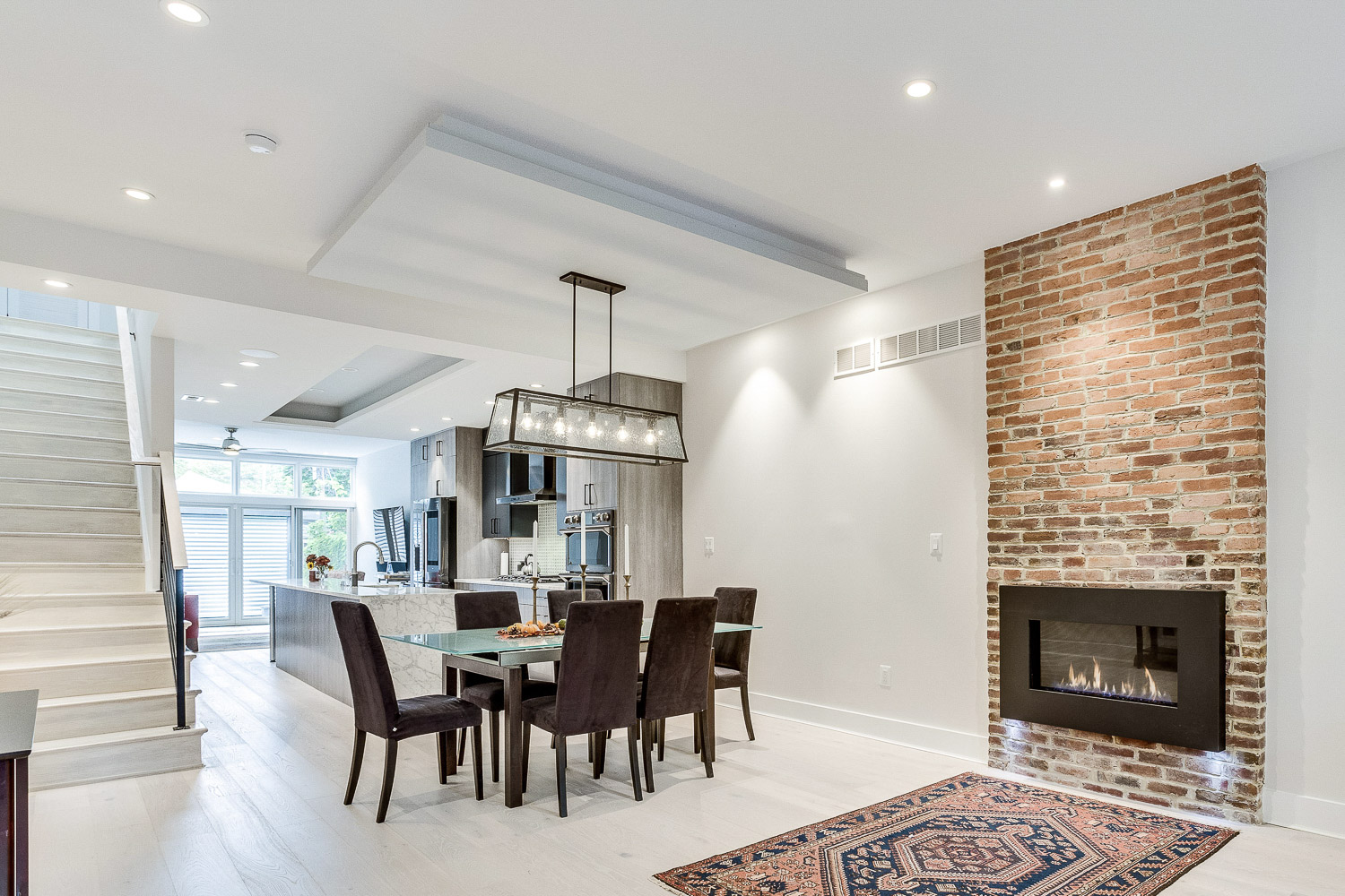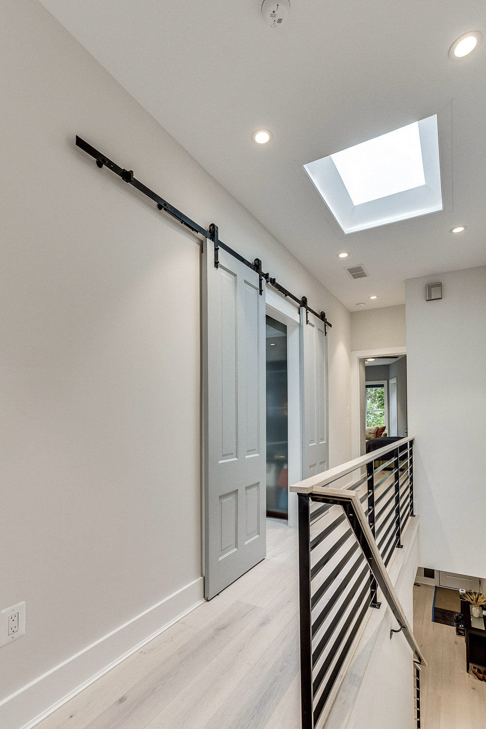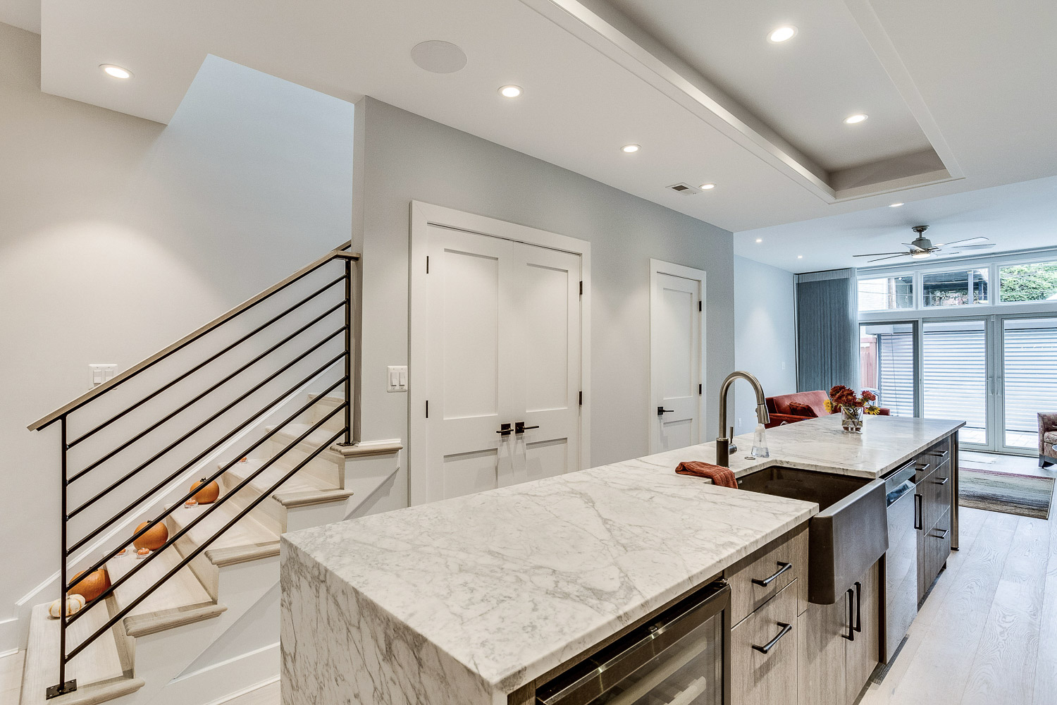 Complete gut renovation and addition to a neglected rowhouse. Redesigned the layout of the entire house and created a new grand kitchen in the center of the home. Selected and specified all decorative materials like lighting, cabinetry, tile, counters, closet systems, repurposing old pocket doors for barn doors on office, designed new railings and stair area, lighting layout, and flooring.
