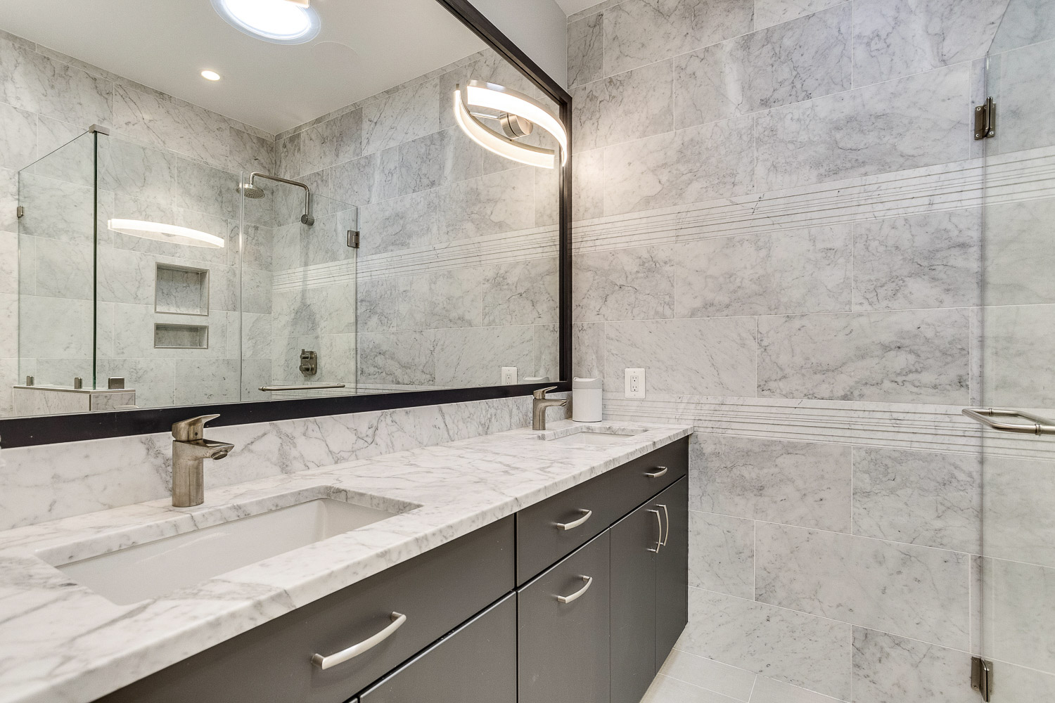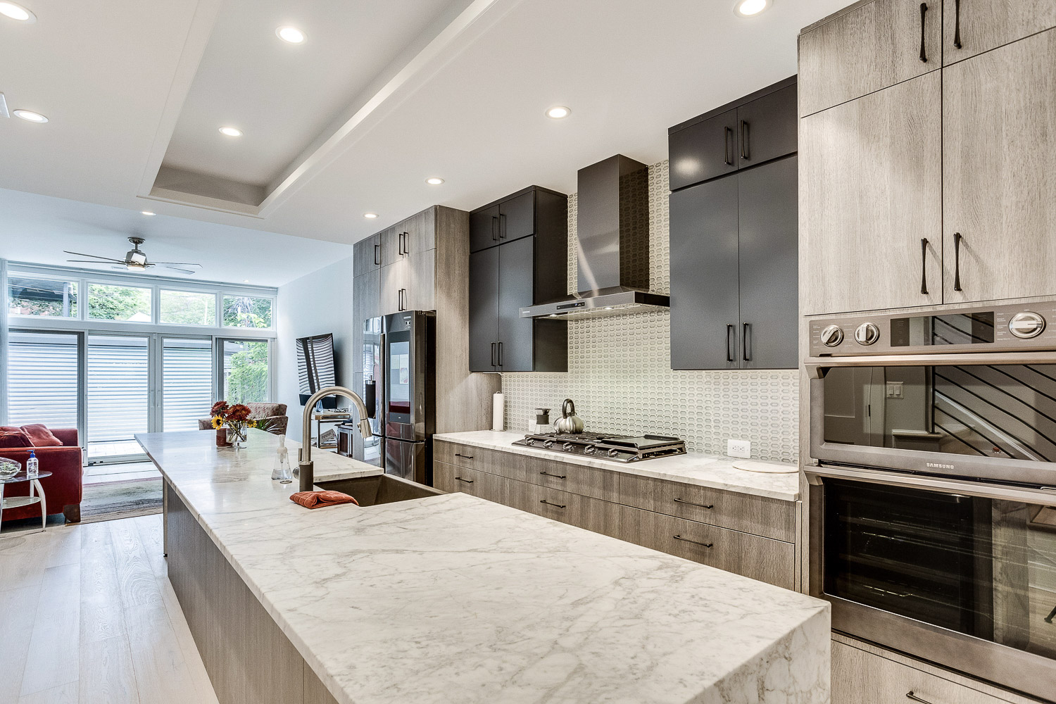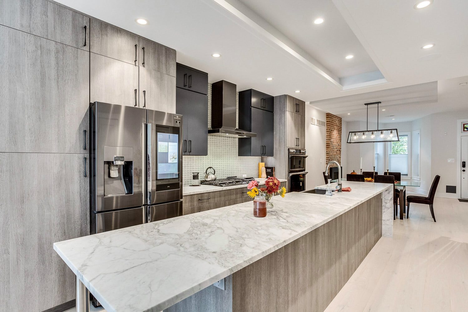 Complete gut renovation and addition to a neglected rowhouse. Redesigned the layout of the entire house and created a new grand kitchen in the center of the home. Selected and specified all decorative materials like lighting, cabinetry, tile, counters, closet systems, repurposing old pocket doors for barn doors on office, designed new railings and stair area, lighting layout, and flooring.